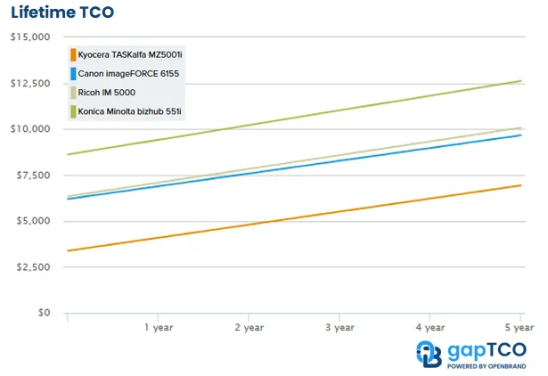 V članku je jasno navedeno, da je Kyocera TASKalfa MZ5001i zmagovalni model z najnižjim skupnim stroškom lastništva (TCO), pred napravami Canon imageFORCE 6155 in Ricoh IM 5000. Gre za razliko, ki lahko v petletnem obdobju pomeni več tisoč evrov prihrankov na posamezno napravo.