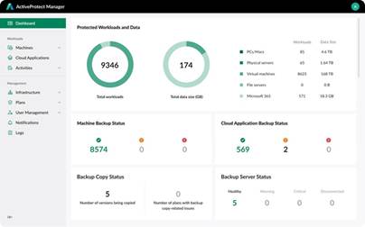 ActiveProtect združuje strojno in programsko opremo v popolnoma integrirano rešitev, ki občutno zmanjšuje skupne stroške lastništva v primerjavi s klasičnimi samostojno sestavljenimi sistemi za varnostno kopiranje. Centralizirano upravlja zaščito do 150.000 delovnih okolij na 2.500 lokacijah – vključno z virtualnimi stroji, strežniki, podatkovnimi bazami, končnimi točkami in storitvami SaaS. Napredne funkcije, kot so WORM (Write Once, Read Many), ločene (air-gapped) varnostne kopije in samodejno preverjanje celovitosti podatkov, zagotavljajo celovito zaščito pred sodobnimi kibernetskimi grožnjami.